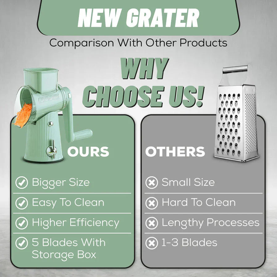 • Multi-function prep tool for slicing, grating, and shredding