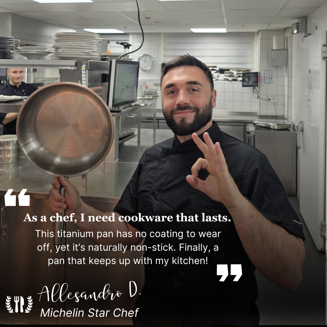 Our pans use 100% pure Grade 1 titanium, finished with a hand-hammered microtexture. This creates natural valleys that minimize sticking, improve airflow, and make the pan hydrophobic over time. It’s a naturally low-stick surface without Teflon, coatings or chemicals.